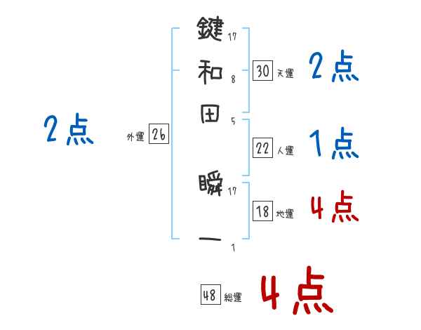 天運![]() | 鍵和田瞬一さんの天運は30画の2つ星!浮き沈みの激しさに注意しましょう。 家系が持つ宿命的な運勢を表します。祖先から受け継いだ苗字ですので自分の力が及びません。家柄を象徴します。 |