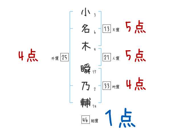 天運![]() | 小名木瞬乃輔さんの天運は13画の5つ星!才能に恵まれ人気がある。名声を手に入れる。円満な人生。 家系が持つ宿命的な運勢を表します。祖先から受け継いだ苗字ですので自分の力が及びません。家柄を象徴します。 |