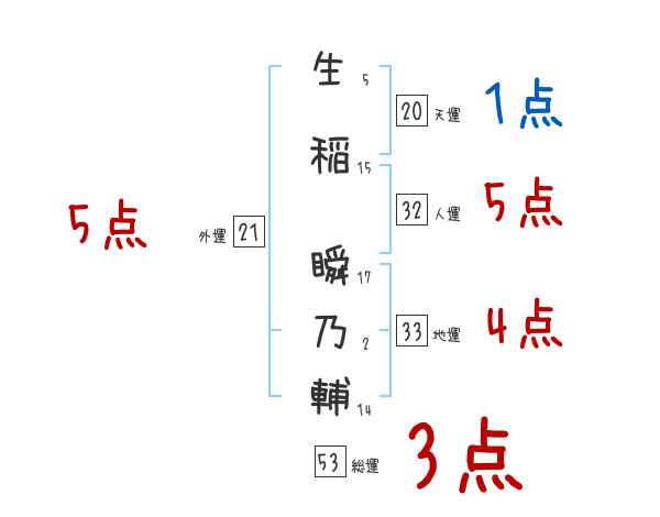 人運![]() | 生稲瞬乃輔さんの人運は32画の5つ星!柔軟性があり成功する。チャンスが多く金運が良い。 性格や才能などを表す2番目に重要な運勢です。人間関係や協調性、社会的な成功に影響します。主に20歳から50歳ぐらいまでの中年期の運勢を表します。 |