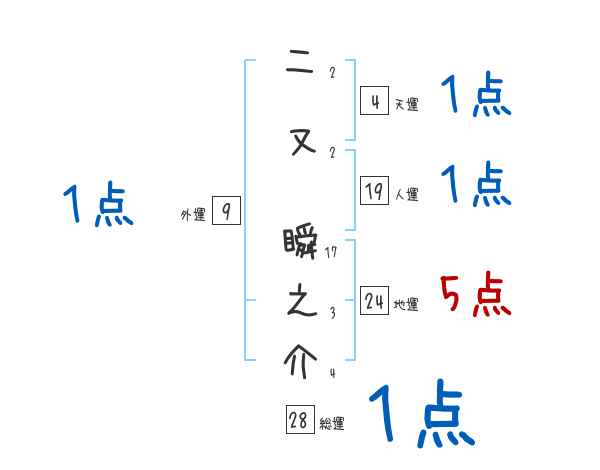 天運![]() | 二又瞬之介さんの天運は4画の1つ星!感情が不安定で苦労するかも。周囲との協調を心掛けましょう。 家系が持つ宿命的な運勢を表します。祖先から受け継いだ苗字ですので自分の力が及びません。家柄を象徴します。 |