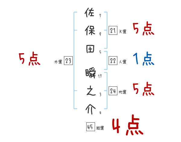 外運![]() | 佐保田瞬之介さんの外運は23画の5つ星!想像力に優れ活力がある。一代で成功し名誉を手に入れる。 生活面を象徴する運勢です。外部から受ける影響力を表し、結婚運、家庭運や職場、環境への順応性を表します。 |