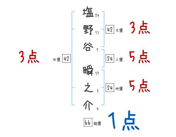 外運![]() | 塩野谷瞬之介さんの外運は42画の3つ星!病気に注意。多芸であるが消極的でおとなしい。 生活面を象徴する運勢です。外部から受ける影響力を表し、結婚運、家庭運や職場、環境への順応性を表します。 |