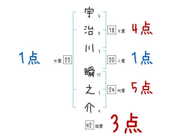 外運![]() | 宇治川瞬之介さんの外運は22画の1つ星!努力することが苦手ないっぽう手先が器用。芸術性にも優れる。 生活面を象徴する運勢です。外部から受ける影響力を表し、結婚運、家庭運や職場、環境への順応性を表します。 |