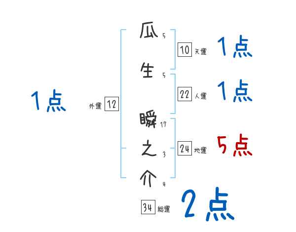 | 総運  | 瓜生瞬之介さんの総運は34画の2つ星!独創性に優れるが、自尊心が強く災難に注意しましょう。あなたの人生を表す1番重要な運勢です。生涯を通じて影響する総合運となり、主に50歳以降の晩年期に影響を及ぼします。 |