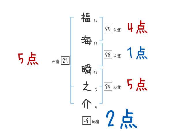 天運![]() | 福海瞬之介さんの天運は25画の4つ星!個性があり才能があふれる。強運の持ち主で発展する。 家系が持つ宿命的な運勢を表します。祖先から受け継いだ苗字ですので自分の力が及びません。家柄を象徴します。 |