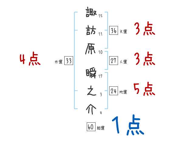 天運![]() | 諏訪原瞬之介さんの天運は36画の3つ星!先見性が豊かです。多少神経質で苦労することも。 家系が持つ宿命的な運勢を表します。祖先から受け継いだ苗字ですので自分の力が及びません。家柄を象徴します。 |