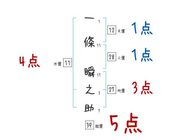 人運![]() | 一條瞬之助さんの人運は28画の1つ星!家庭環境に注意。スポーツで活躍できる能力があるかも。 性格や才能などを表す2番目に重要な運勢です。人間関係や協調性、社会的な成功に影響します。主に20歳から50歳ぐらいまでの中年期の運勢を表します。 |