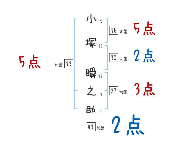 天運![]() | 小塚瞬之助さんの天運は16画の5つ星!人望が厚く大きく発展する。逆転成功が見える。 家系が持つ宿命的な運勢を表します。祖先から受け継いだ苗字ですので自分の力が及びません。家柄を象徴します。 |