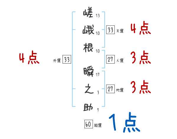 総運![]() | 嵯峨根瞬之助さんの総運は60画の1つ星!悲観的で迷いやすい。波乱が多く損をしないように。 あなたの人生を表す1番重要な運勢です。生涯を通じて影響する総合運となり、主に50歳以降の晩年期に影響を及ぼします。 |