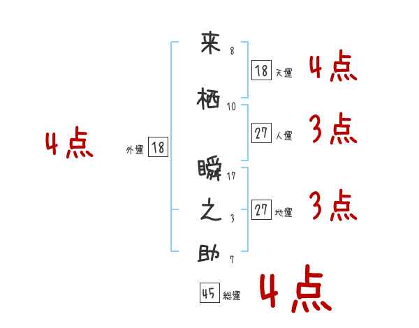 外運![]() | 来栖瞬之助さんの外運は18画の4つ星!情熱的で剛気。忍耐力があり信頼される。 生活面を象徴する運勢です。外部から受ける影響力を表し、結婚運、家庭運や職場、環境への順応性を表します。 |