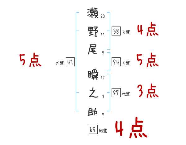 総運![]() | 瀬野尾瞬之助さんの総運は65画の4つ星!幸運に恵まれ繁栄する。包容力がある。 あなたの人生を表す1番重要な運勢です。生涯を通じて影響する総合運となり、主に50歳以降の晩年期に影響を及ぼします。 |