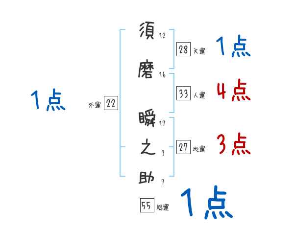 外運![]() | 須磨瞬之助さんの外運は22画の1つ星!努力することが苦手ないっぽう手先が器用。芸術性にも優れる。 生活面を象徴する運勢です。外部から受ける影響力を表し、結婚運、家庭運や職場、環境への順応性を表します。 |