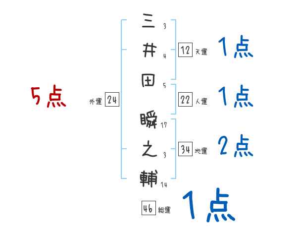 天運![]() | 三井田瞬之輔さんの天運は12画の1つ星!簡単な失敗で諦めてしまいやすいかも。着実に行動すると良いでしょう。 家系が持つ宿命的な運勢を表します。祖先から受け継いだ苗字ですので自分の力が及びません。家柄を象徴します。 |