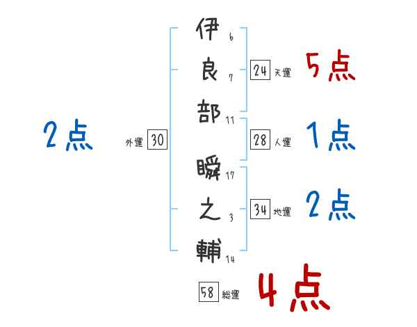 天運![]() | 伊良部瞬之輔さんの天運は24画の5つ星!家庭運が良く順調な人生。金運にも恵まれる。 家系が持つ宿命的な運勢を表します。祖先から受け継いだ苗字ですので自分の力が及びません。家柄を象徴します。 |