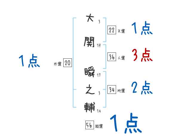 | 天運  | 大関瞬之輔さんの天運は22画の1つ星!努力することが苦手ないっぽう手先が器用。芸術性にも優れる。家系が持つ宿命的な運勢を表します。祖先から受け継いだ苗字ですので自分の力が及びません。家柄を象徴します。 |