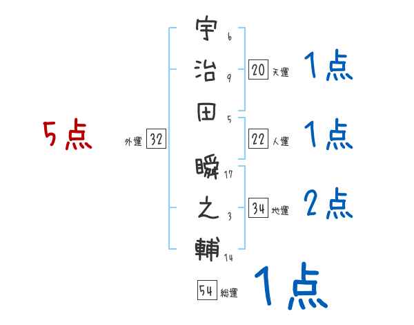 外運![]() | 宇治田瞬之輔さんの外運は32画の5つ星!柔軟性があり成功する。チャンスが多く金運が良い。 生活面を象徴する運勢です。外部から受ける影響力を表し、結婚運、家庭運や職場、環境への順応性を表します。 |