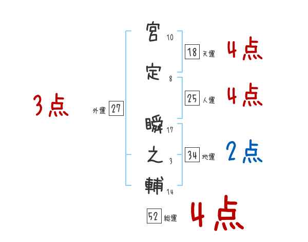 天運![]() | 宮定瞬之輔さんの天運は18画の4つ星!情熱的で剛気。忍耐力があり信頼される。 家系が持つ宿命的な運勢を表します。祖先から受け継いだ苗字ですので自分の力が及びません。家柄を象徴します。 |