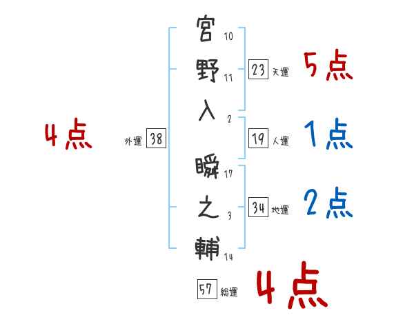 外運![]() | 宮野入瞬之輔さんの外運は38画の4つ星!温厚な性格で技術的な才能を発揮する。職人的な仕事に向いている。 生活面を象徴する運勢です。外部から受ける影響力を表し、結婚運、家庭運や職場、環境への順応性を表します。 |