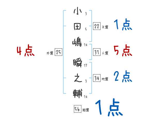 総運![]() | 小田嶋瞬之輔さんの総運は56画の1つ星!消極的で無気力になりがち。誠実な気持ちが必要でしょう。 あなたの人生を表す1番重要な運勢です。生涯を通じて影響する総合運となり、主に50歳以降の晩年期に影響を及ぼします。 |
