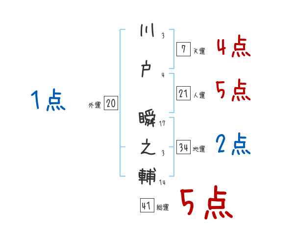 | 人運  | 川戸瞬之輔さんの人運は21画の5つ星!統率力がある。独立し成功する。名誉を手に入れる。性格や才能などを表す2番目に重要な運勢です。人間関係や協調性、社会的な成功に影響します。主に20歳から50歳ぐらいまでの中年期の運勢を表します。 |