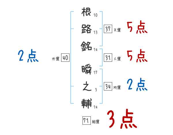 地運![]() | 根路銘瞬之輔さんの地運は34画の2つ星!独創性に優れるが、自尊心が強く災難に注意しましょう。 個性を表す基礎的な運勢です。性格形成や対人関係、行動力など家庭環境に影響されます。主に誕生してから20歳くらいまでの若年期の運勢を表します。 |