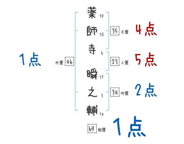 | 天運  | 薬師寺瞬之輔さんの天運は35画の4つ星!温厚な性格で感受性が高い。穏和な性格で人望が厚い。家系が持つ宿命的な運勢を表します。祖先から受け継いだ苗字ですので自分の力が及びません。家柄を象徴します。 |
