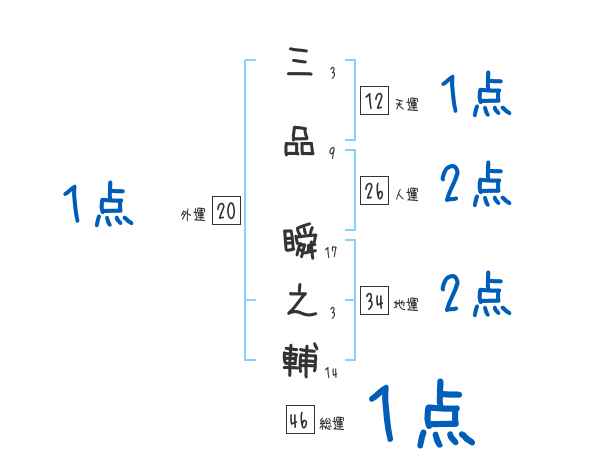 天運![]() | 三品瞬之輔さんの天運は12画の1つ星!簡単な失敗で諦めてしまいやすいかも。着実に行動すると良いでしょう。 家系が持つ宿命的な運勢を表します。祖先から受け継いだ苗字ですので自分の力が及びません。家柄を象徴します。 |