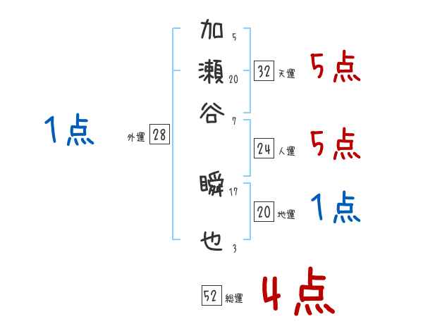 総運![]() | 加瀬谷瞬也さんの総運は52画の4つ星!先見性と独創性に優れ考える力がある。強運の持ち主。 あなたの人生を表す1番重要な運勢です。生涯を通じて影響する総合運となり、主に50歳以降の晩年期に影響を及ぼします。 |