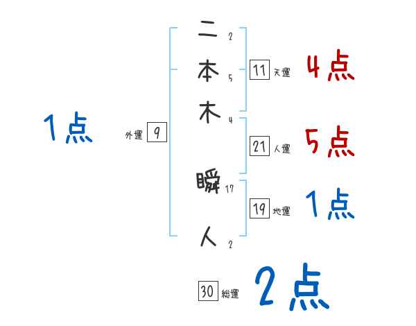 人運![]() | 二本木瞬人さんの人運は21画の5つ星!統率力がある。独立し成功する。名誉を手に入れる。 性格や才能などを表す2番目に重要な運勢です。人間関係や協調性、社会的な成功に影響します。主に20歳から50歳ぐらいまでの中年期の運勢を表します。 |