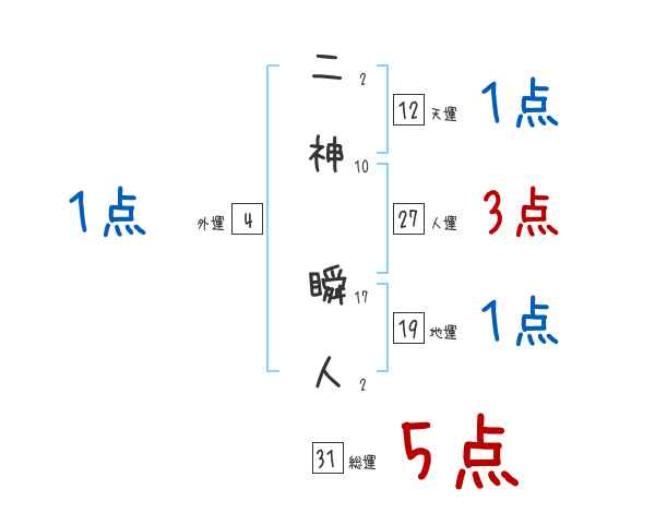 天運![]() | 二神瞬人さんの天運は12画の1つ星!簡単な失敗で諦めてしまいやすいかも。着実に行動すると良いでしょう。 家系が持つ宿命的な運勢を表します。祖先から受け継いだ苗字ですので自分の力が及びません。家柄を象徴します。 |