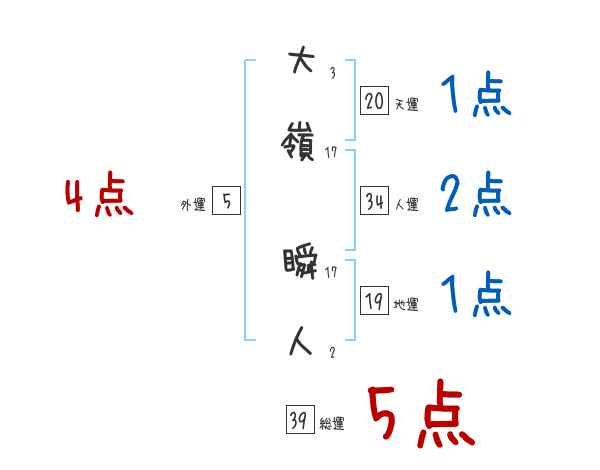 外運![]() | 大嶺瞬人さんの外運は5画の4つ星!健康で安泰。協調性に優れ、財産に恵まれる。 生活面を象徴する運勢です。外部から受ける影響力を表し、結婚運、家庭運や職場、環境への順応性を表します。 |