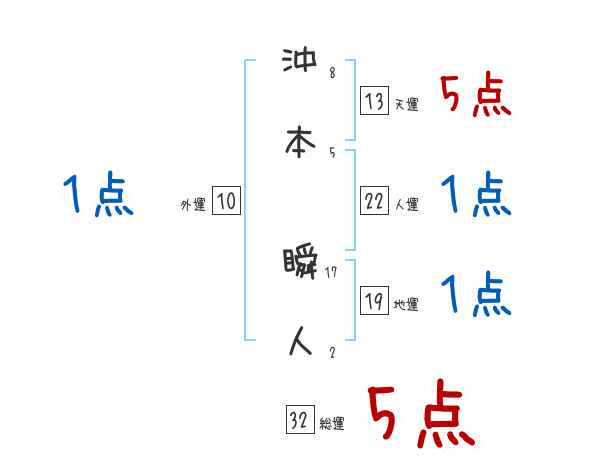 総運![]() | 沖本瞬人さんの総運は32画の5つ星!柔軟性があり成功する。チャンスが多く金運が良い。 あなたの人生を表す1番重要な運勢です。生涯を通じて影響する総合運となり、主に50歳以降の晩年期に影響を及ぼします。 |