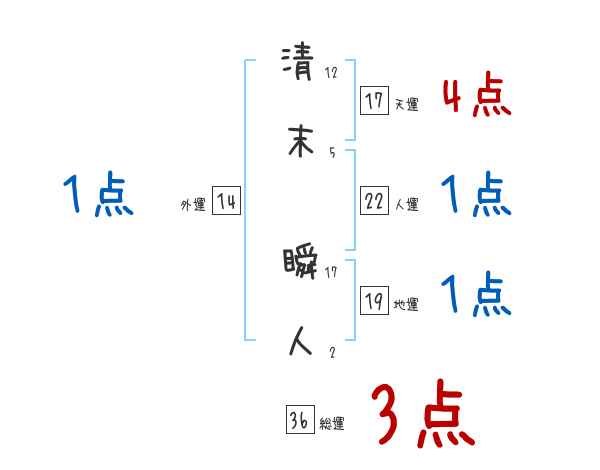 総運![]() | 清末瞬人さんの総運は36画の3つ星!先見性が豊かです。多少神経質で苦労することも。 あなたの人生を表す1番重要な運勢です。生涯を通じて影響する総合運となり、主に50歳以降の晩年期に影響を及ぼします。 |