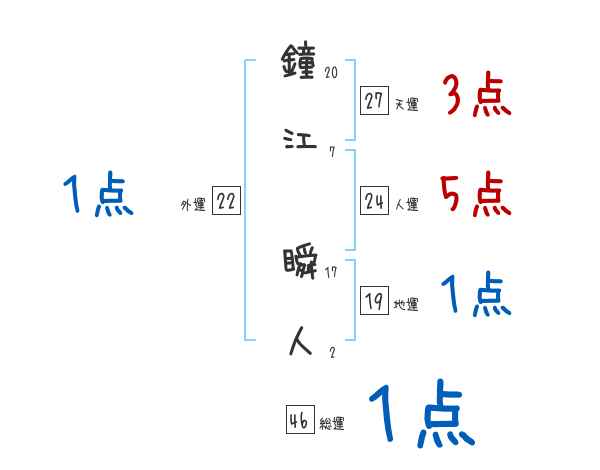 総運![]() | 鐘江瞬人さんの総運は46画の1つ星!迷走することが多く苦労するかも。目先のことにとらわれないように。 あなたの人生を表す1番重要な運勢です。生涯を通じて影響する総合運となり、主に50歳以降の晩年期に影響を及ぼします。 |
