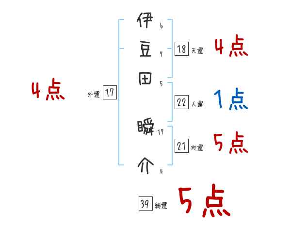 外運![]() | 伊豆田瞬介さんの外運は17画の4つ星!積極的な行動力。地位を気づき財産を手に入れる。純粋な心と直感力。 生活面を象徴する運勢です。外部から受ける影響力を表し、結婚運、家庭運や職場、環境への順応性を表します。 |