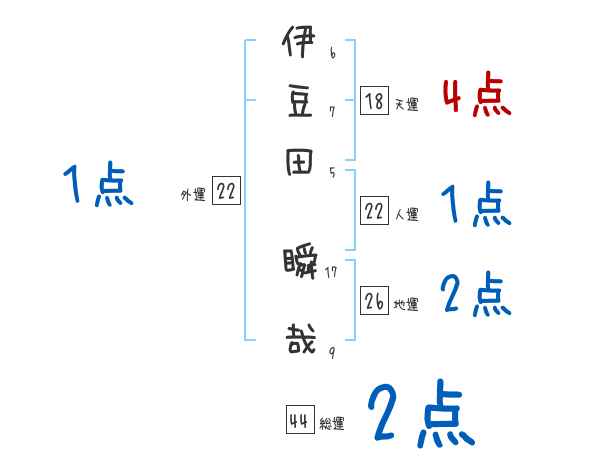 天運![]() | 伊豆田瞬哉さんの天運は18画の4つ星!情熱的で剛気。忍耐力があり信頼される。 家系が持つ宿命的な運勢を表します。祖先から受け継いだ苗字ですので自分の力が及びません。家柄を象徴します。 |