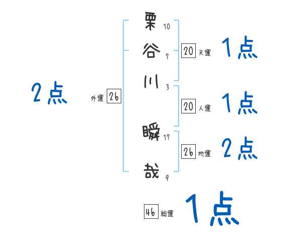 総運![]() | 栗谷川瞬哉さんの総運は46画の1つ星!迷走することが多く苦労するかも。目先のことにとらわれないように。 あなたの人生を表す1番重要な運勢です。生涯を通じて影響する総合運となり、主に50歳以降の晩年期に影響を及ぼします。 |