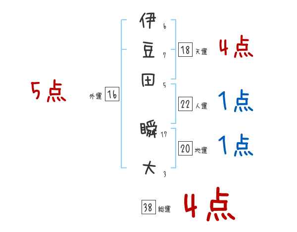 外運![]() | 伊豆田瞬大さんの外運は16画の5つ星!人望が厚く大きく発展する。逆転成功が見える。 生活面を象徴する運勢です。外部から受ける影響力を表し、結婚運、家庭運や職場、環境への順応性を表します。 |