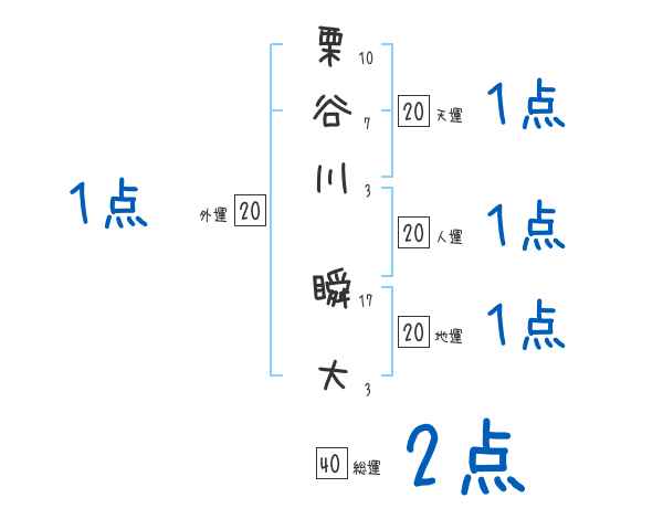 総運![]() | 栗谷川瞬大さんの総運は40画の2つ星!自信過剰で物事に固執するためトラブルに注意。 あなたの人生を表す1番重要な運勢です。生涯を通じて影響する総合運となり、主に50歳以降の晩年期に影響を及ぼします。 |