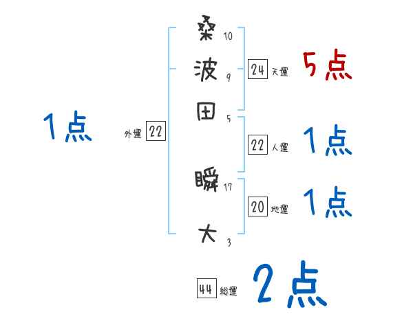 天運![]() | 桑波田瞬大さんの天運は24画の5つ星!家庭運が良く順調な人生。金運にも恵まれる。 家系が持つ宿命的な運勢を表します。祖先から受け継いだ苗字ですので自分の力が及びません。家柄を象徴します。 |