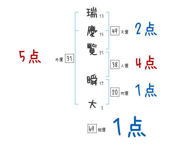 天運![]() | 瑞慶覧瞬大さんの天運は49画の2つ星!不安定な性格で明暗がある人生。周りの人には支援されやすい。 家系が持つ宿命的な運勢を表します。祖先から受け継いだ苗字ですので自分の力が及びません。家柄を象徴します。 |