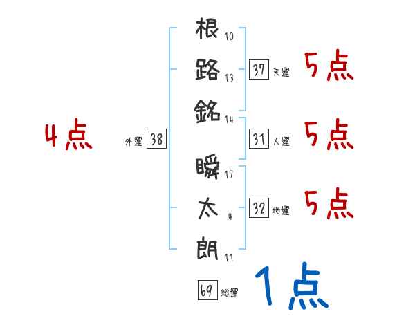 地運![]() | 根路銘瞬太朗さんの地運は32画の5つ星!柔軟性があり成功する。チャンスが多く金運が良い。 個性を表す基礎的な運勢です。性格形成や対人関係、行動力など家庭環境に影響されます。主に誕生してから20歳くらいまでの若年期の運勢を表します。 |