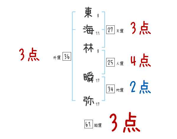人運![]() | 東海林瞬弥さんの人運は25画の4つ星!個性があり才能があふれる。強運の持ち主で発展する。 性格や才能などを表す2番目に重要な運勢です。人間関係や協調性、社会的な成功に影響します。主に20歳から50歳ぐらいまでの中年期の運勢を表します。 |