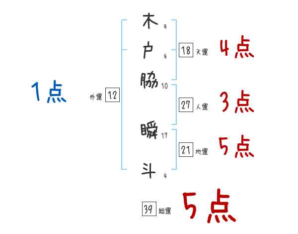 総運![]() | 木戸脇瞬斗さんの総運は39画の5つ星!社交性に優れ人望が厚い。人の上に立ち成功する。 あなたの人生を表す1番重要な運勢です。生涯を通じて影響する総合運となり、主に50歳以降の晩年期に影響を及ぼします。 |