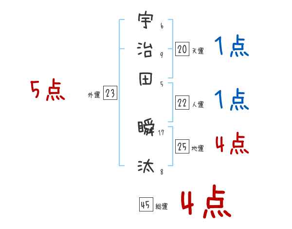 外運![]() | 宇治田瞬汰さんの外運は23画の5つ星!想像力に優れ活力がある。一代で成功し名誉を手に入れる。 生活面を象徴する運勢です。外部から受ける影響力を表し、結婚運、家庭運や職場、環境への順応性を表します。 |