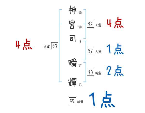 外運![]() | 神宮司瞬輝さんの外運は33画の4つ星!権力志向でプライドが高い。勇気があり運を切り開き成功する。 生活面を象徴する運勢です。外部から受ける影響力を表し、結婚運、家庭運や職場、環境への順応性を表します。 |