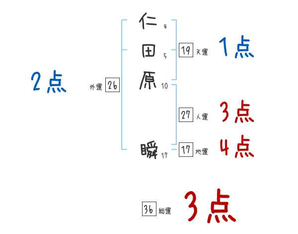 人運![]() | 仁田原瞬さんの人運は27画の3つ星!頭脳明晰だが強情で摩擦が多い傾向。孤立に注意。 性格や才能などを表す2番目に重要な運勢です。人間関係や協調性、社会的な成功に影響します。主に20歳から50歳ぐらいまでの中年期の運勢を表します。 |