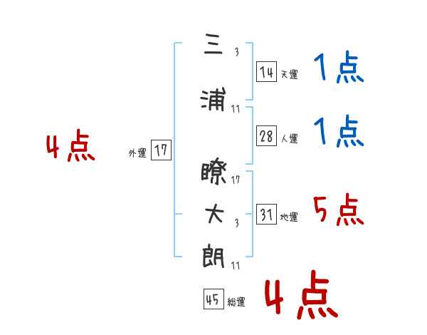 外運![]() | 三浦瞭大朗さんの外運は17画の4つ星!積極的な行動力。地位を気づき財産を手に入れる。純粋な心と直感力。 生活面を象徴する運勢です。外部から受ける影響力を表し、結婚運、家庭運や職場、環境への順応性を表します。 |