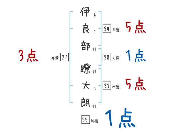 外運![]() | 伊良部瞭大朗さんの外運は27画の3つ星!頭脳明晰だが強情で摩擦が多い傾向。孤立に注意。 生活面を象徴する運勢です。外部から受ける影響力を表し、結婚運、家庭運や職場、環境への順応性を表します。 |