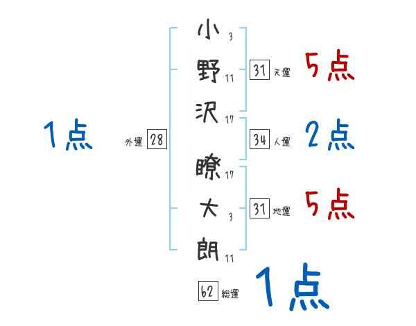 外運![]() | 小野沢瞭大朗さんの外運は28画の1つ星!家庭環境に注意。スポーツで活躍できる能力があるかも。 生活面を象徴する運勢です。外部から受ける影響力を表し、結婚運、家庭運や職場、環境への順応性を表します。 |